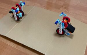 まずは、全日本中学生ロボットコンテストの映像を見て、色々なロボットがあることを知りました。そして相撲ロボットを製作。モータスイッチONすると、前進しながら押し出す相撲です。後半は、更に改造し、土俵の上で、お友達同士で対決(写真左&右)。負けないようにどうすれば良いか考えて改良を重ねて独自ロボットに発展させてくれましたよ!
