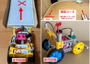 まず、モーターカーをつくり、電池で走らせます。電池1個もしくは電池2個を並列に接続する(写真左)と坂道を上がれない。しかし、電池2個を直列に接続する(写真右)と坂道を登れるようになりました。配線も自分でできました。最終的には、坂を越えて、旋回コースを走らせ、皆さん、満足そうでした。