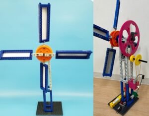 風車にうちわで風をおくるのですが、中々うまく回りません。しかし、4枚の羽根の角度を試行錯誤で調整することにより、回すことが出来ました(写真左)。